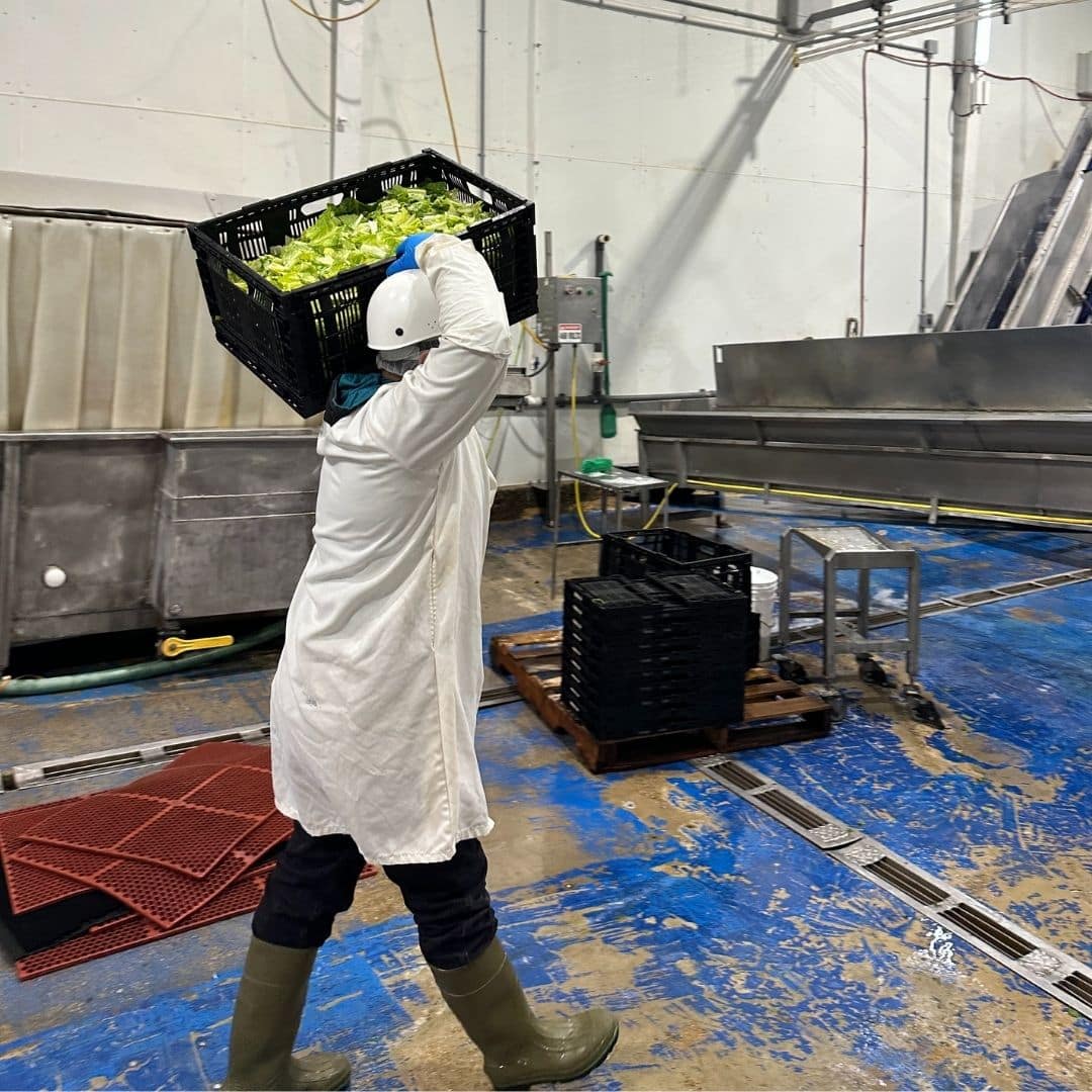When the machine arrived, we gathered our partners at Jayleaf’s facility to see the process in action, and it was extraordinary. After gearing up in coats, gloves, and hairnets, we stepped into the warehouse where the magic happens. Inside, we watched organic romaine move through a carefully choreographed system. The lettuce passed through the chopping machine, traveled along conveyor belts, entered a wash of water and peracetic acid for organic sanitation, moved into an industrial salad spinner, and then onto another conveyor belt where it was bagged and sealed with nitrogen for freshness. Romaine is the only salad green that does not tolerate oxygen well.